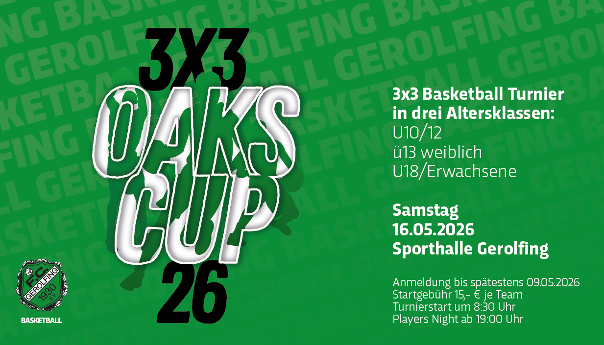Auch dieses Jahr lädt der FCG zum 3×3 Oaks Cup nach Gerolfing ein. Wer die ersten drei Male dabei war, weiß, dass bei diesem Spektakel nicht nur Leistung, sondern mittlerweile auch Show unter dem Korb gezeigt wird. Sowas sollte man sich nicht entgehen lassen – besser noch, seit Teil des Events und tretet mit eurer eigenen Mannschaft an.
